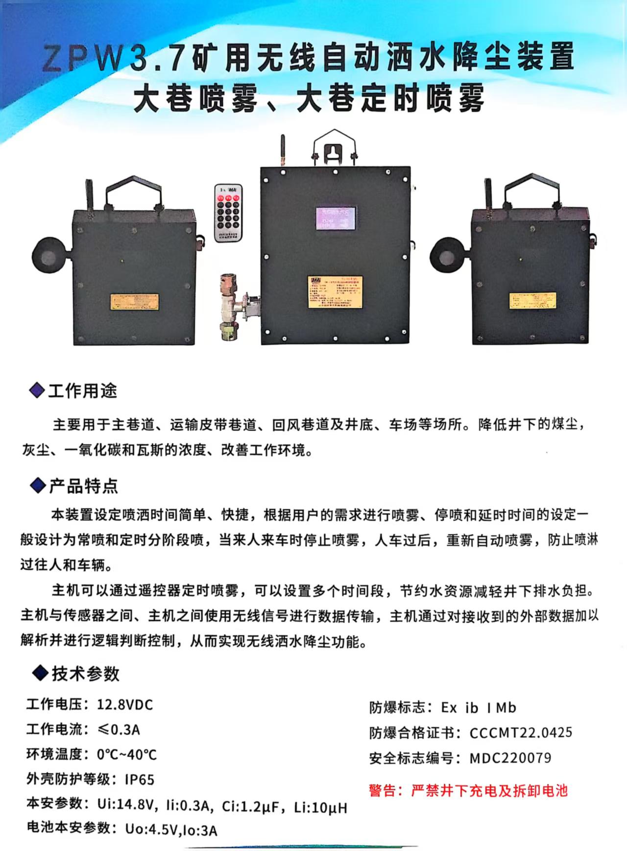 ◆ Mục đích công việc Nó chủ yếu được sử dụng ở đường chính, đường vành đai giao thông, đường hàng không quay trở lại, đáy giếng, bãi đậu xe và những nơi khác. Giảm nồng độ bụi than, carbon monoxide và khí đốt và cải thiện môi trường làm việc. Đặc trưng: Thiết bị cài đặt thời gian phun đơn giản và nhanh chóng, tùy theo nhu cầu của người sử dụng mà phun, dừng phun và cài đặt thời gian trễ nói chung được thiết kế để phun đều đặn và phun đều đặn theo từng giai đoạn, khi có người đến xe dừng phun, sau khi người và xe tự động phun lại, để tránh phun ngang người và phương tiện. Máy chủ có thể được phun đều đặn thông qua điều khiển từ xa và có thể cài đặt nhiều khoảng thời gian để tiết kiệm tài nguyên nước và giảm gánh nặng thoát nước ngầm. Máy chủ sử dụng tín hiệu không dây để truyền dữ liệu giữa máy chủ và cảm biến, đồng thời máy chủ phân tích dữ liệu bên ngoài nhận được và điều khiển dữ liệu đó một cách hợp lý để nhận ra chức năng giảm bụi rượu không dây. ◆ Thông số kỹ thuật Điện áp hoạt động: 12.8VDC Dòng điện hoạt động: .30,3A Nhiệt độ môi trường: 0°C~40°C Đánh giá bao vây: IP65 Thông số an toàn nội tại: Ui: 14.8V, Ii: 0.3A, Ci: 1.2μF, Li: 10μH Dấu chống cháy nổ: ExiblMb Chứng chỉ chống cháy nổ: CCCMT22.0425 Số biển báo an toàn: MDC220079 Cảnh báo: Nghiêm cấm sạc và tháo pin dưới lòng đất Thông số an toàn nội tại của pin: Uo: 4.5V, 1o: 3A
